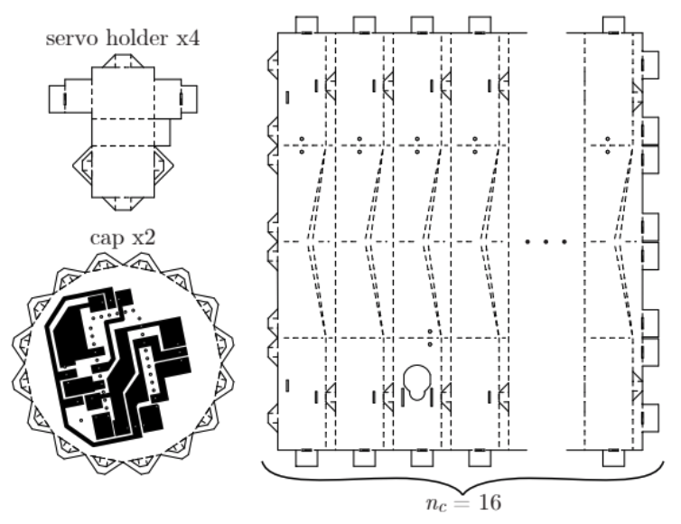 Our design demonstrates bistability, snapping between two states: expanded and compressed. As such, no actuation is required for the jump itself, but rather, simply to compress and quickly release the robot. I designed, 3D printed, and tested a small timing mechanism to facilitate this motion by displacing a taut string with connections on both of the robot’s sections. I then wrote an Arduino script actuating the rotation of these 4 “horns” by attaching them to servo motors controlled by an Arduino Pro Mini, both connected to the main robot body using only additional lightweight origami Mylar parts. In the end, we published a paper on the project, REBOund: Untethered Origami Jumping Robot with Controllable Jump Height (linked below), to ICRA 2020 Robotics Conference